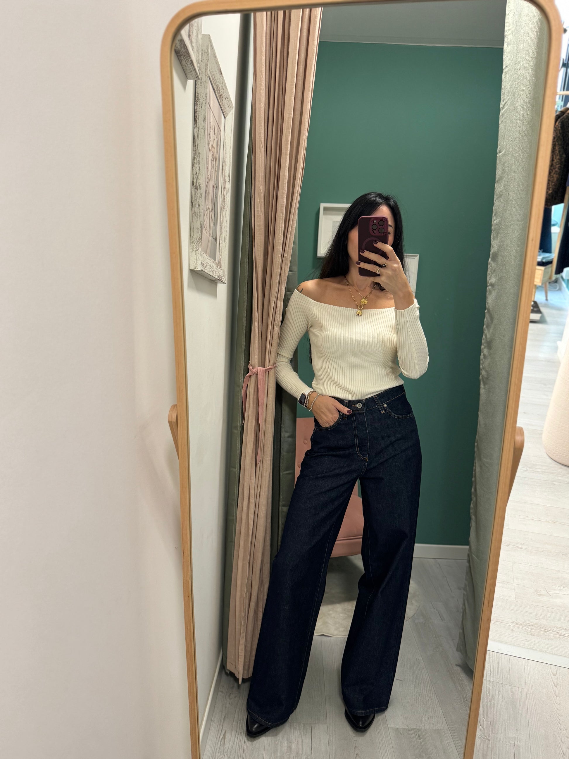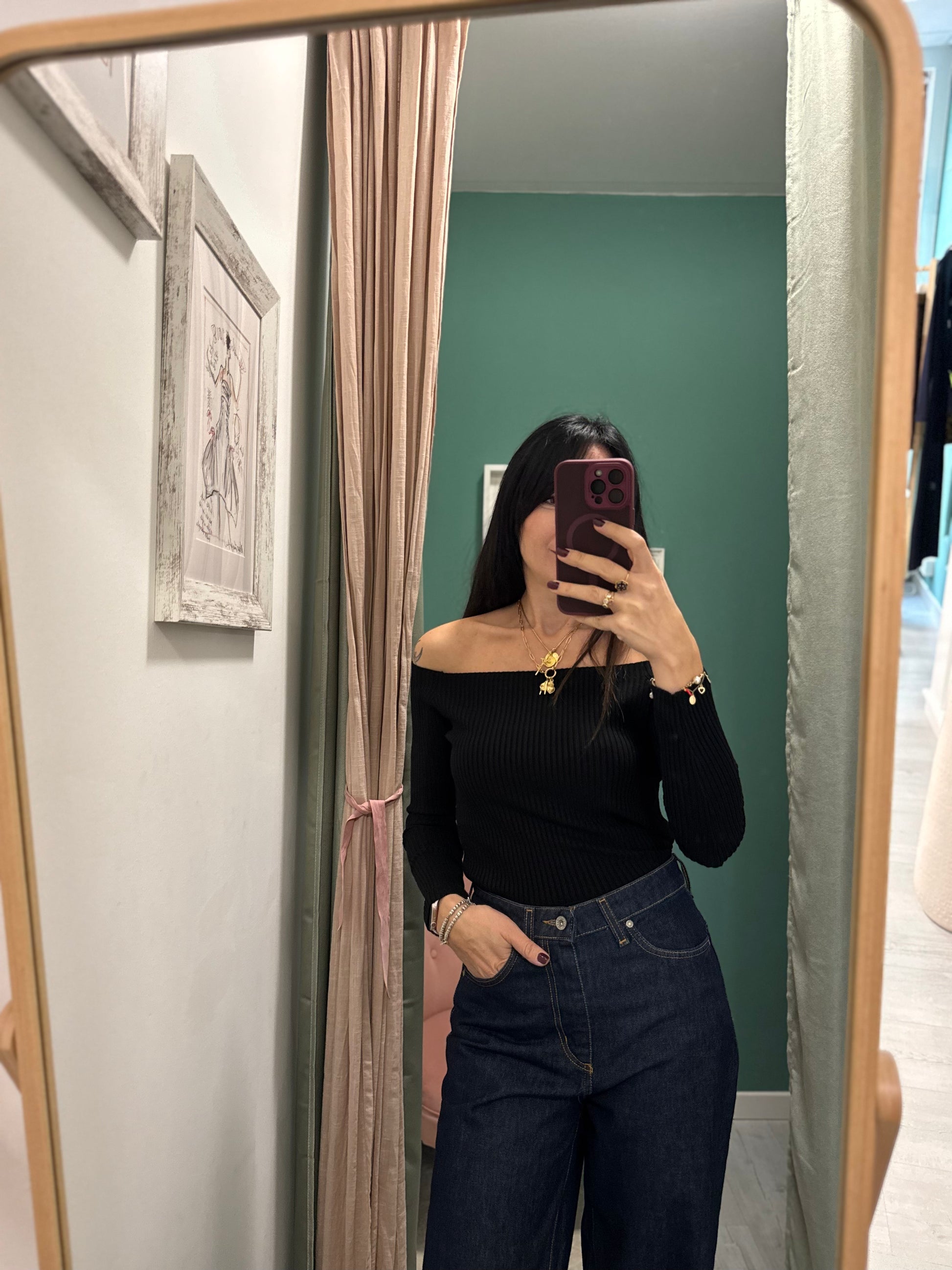 Maglia a costine con spalle scoperte. Disponibile in vari colori